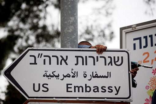 A Reuters witness saw workmen installing signs in English, Hebrew and Arabic near a U.S. consulate building in southern Jerusalem that will be repurposed as the embassy when it is officially relocated from Tel Aviv on May 14.