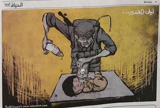 The newspaper features a large cartoon depicting an Israeli soldier replacing a Palestinian baby's bottle with a bottle of poison.