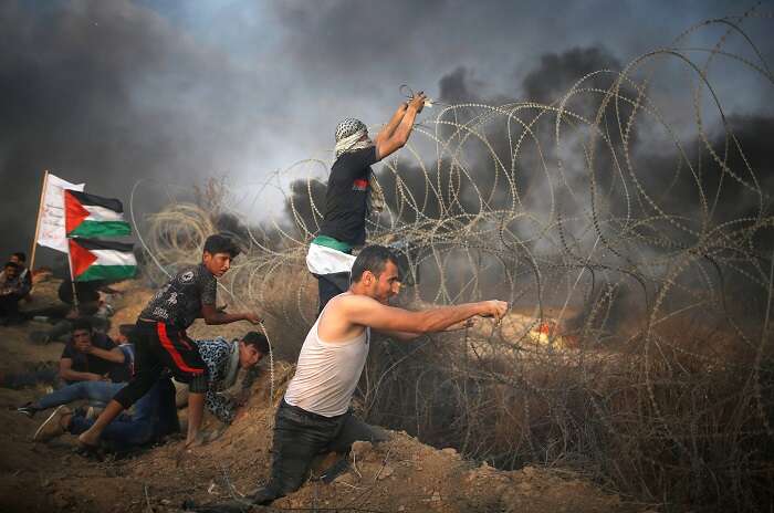 The military said that 10,000 Palestinians rioted near the border, torching tires and hurling stones, grenades and explosives at the troops across the fence.