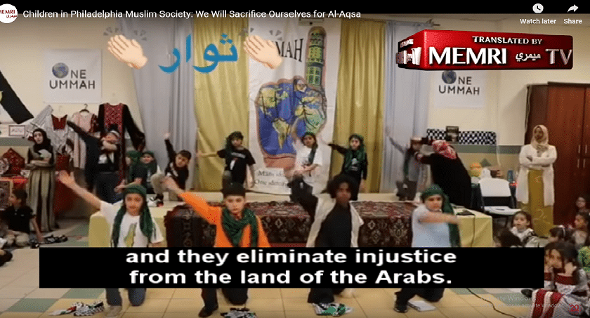 In the two-minute video from an April event, two young girls are shown reading. One says, "We will sacrifice our souls without hesitation, we will chop off their heads" and liberate Al-Aqsa Mosque in Jerusalem.