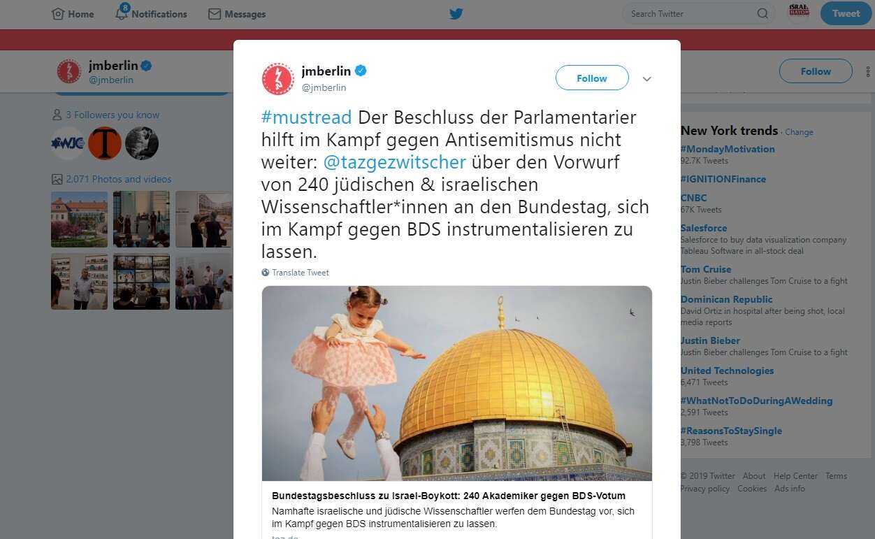On Sunday, the Jewish Museum sent out another tweet in which it said that by tagging the Taz article, the institution had not taken any stand against the Bundestag's anti-BDS resolution.