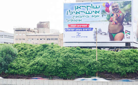 Billboards showing a photoshopped image of Hamas leader Ismail Haniyeh sporting a green bikini bottom and a lei were put up at three heavily-trafficked locations in Tel Aviv on Monday morning.