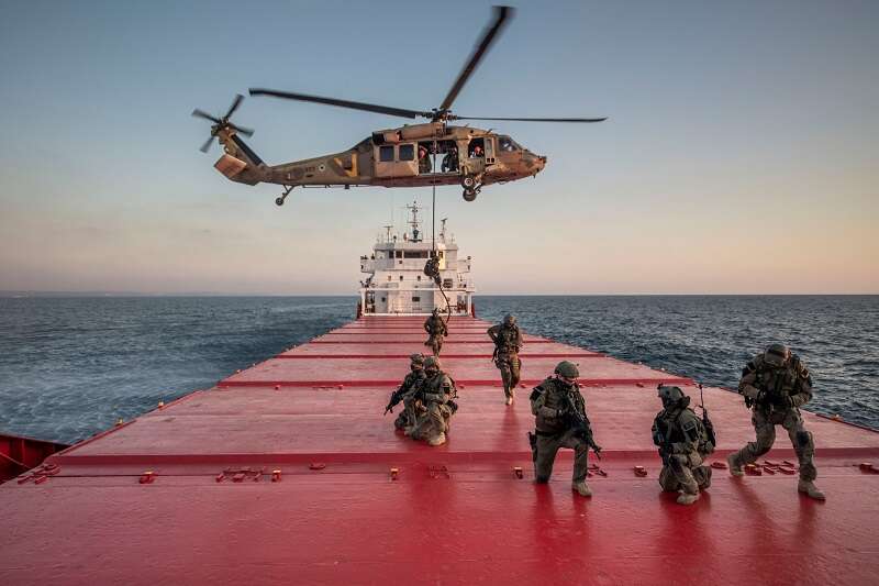 Israeli officials said the two militaries "exercised regaining control of a hijacked ship and extracting forces from enemy territory." Footage released by the army showed naval commandos parachuting and rappelling onto a ship and storming a container ship-like vessel during the exercise, dubbed "Naval Rose."