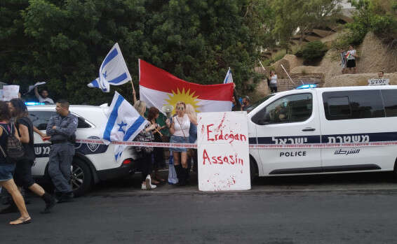 The demonstrators waved Israeli and Kurdish flags and carried placards condemning the Turkish action. After the demonstration outside the Turkish embassy, the activists set out for the US Embassy to continue their protest there.
