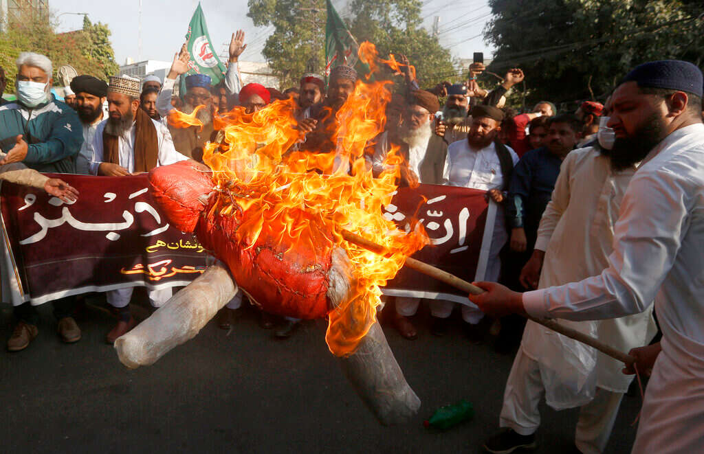 Hundreds of protesters in Pakistan on Sunday burned effigies of France's leader and chanted anti-French slogans, as French President Emmanuel Macron tried to send a message of understanding to Muslims around the world.