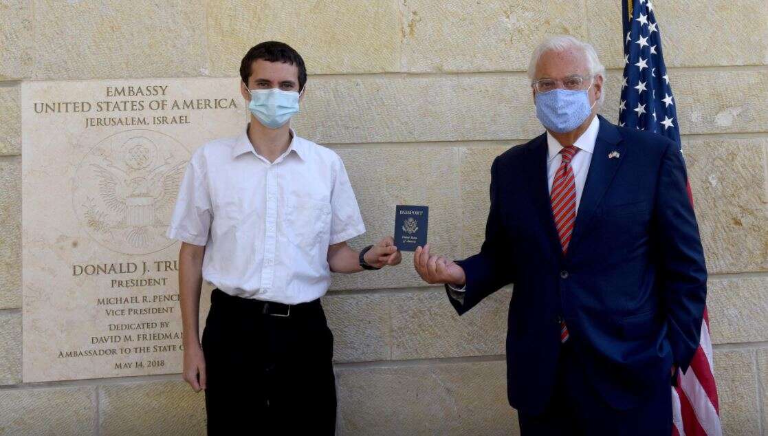 The US Ambassador to Israel presented the document to 18-year-old Menachem Zivotofsky after a change of policy by President Donald Trump that is likely to please pro-Israel supporters ahead of next week's election, but that Palestinians condemned as a violation of international law.