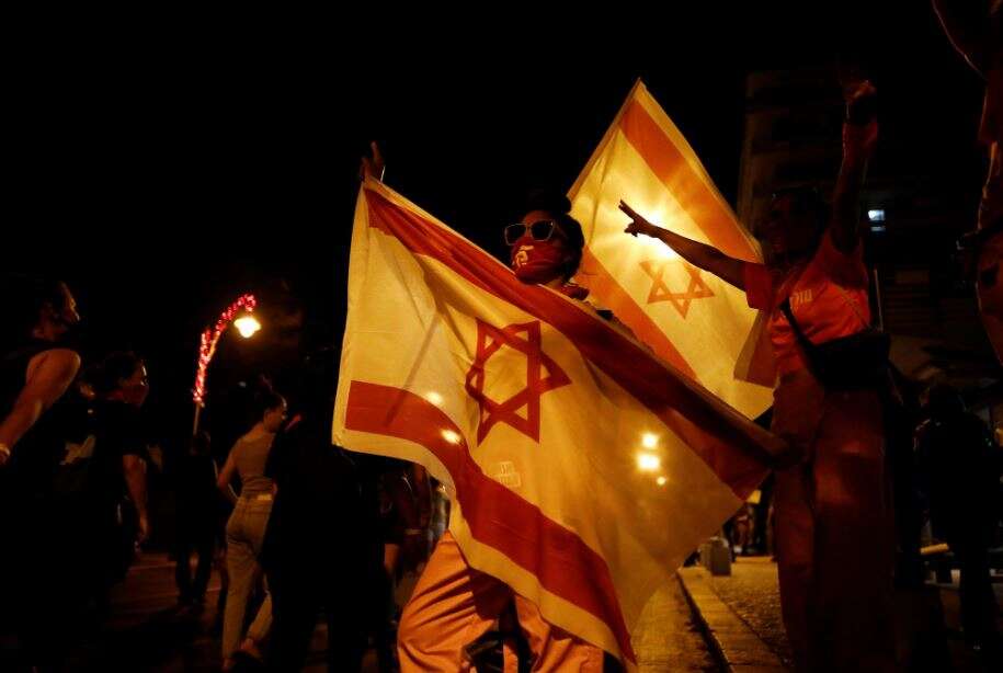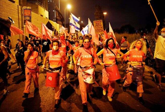 It's Saturday night in Jerusalem and a group of protesters dressed in fluorescent pink are preparing to join a weekly demonstration outside Israeli Prime Minister Benjamin Netanyahu's official residence demanding he quit.
