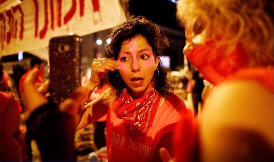 Yarden Grosser, 36, a member of "The Pink Front," applies face paint as she takes part in a weekly anti-Netanyahu demonstration, in Jerusalem (Reuters/Corinna Kern)