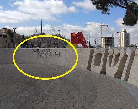 Graffiti was discovered Friday on a monument in the square that leads to the Yad Vashem Holocaust Memorial in Jerusalem.