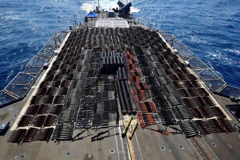 The US Navy's Fifth Fleet said on Saturday that the guided-missile cruiser USS Monterey seized an illicit shipment of weapons from a stateless dhow in international water of the North Arabian Sea on May 6-7.