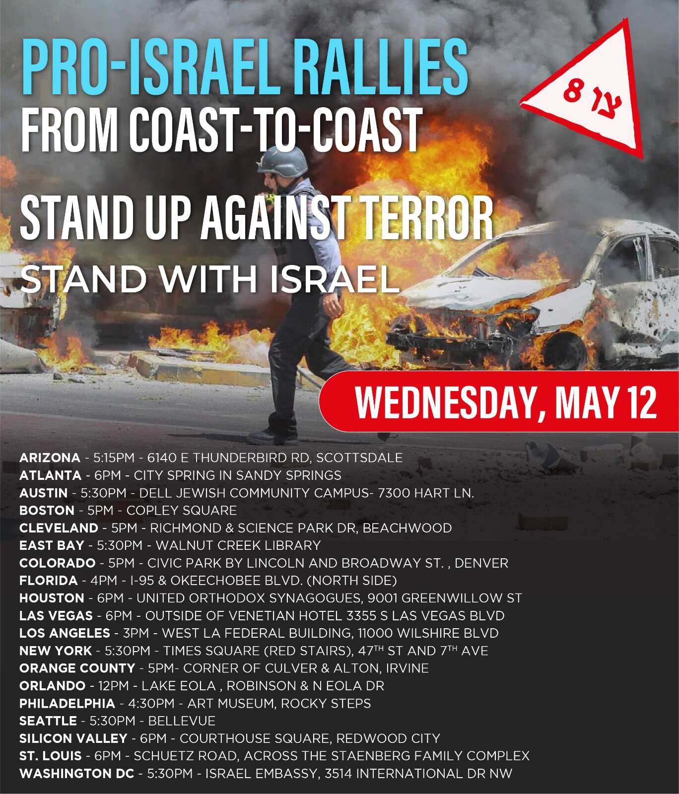 Rallies are scheduled for major cities including in New York City's Times Square at 5:30 p.m., at the Red Stairs, 47th St. & Seventh Ave.; in Boston at 5 p.m., in Copley Square off Boylston Street; and in Los Angeles at 3 p.m. (PT), at the West LA Federal Building, 11000 Wilshire Blvd. Other rallies are set for Atlanta at 6 p.m., City Spring in Sandy Springs; Austin at 5:30 p.m., the Dell Jewish Community Campus, 7300 Hart Lane; Cleveland, at 5 p.m., Richmond & Science Park Dr., Beachwood; Denver, at 5 p.m., Civic Park by Lincoln and Broadway Street; Houston at 6 p.m., the United Orthodox Synagogues, 9001 Greenwillow St.; Irvine, CA (Orange County), at 5 p.m., the corner of Culver & Alton; Las Vegas at 6 p.m., outside the Venetian Hotel, 3355 S. Las Vegas Blvd.; Orlando, FL at noon, Lake Eola, Robinson & North Eola Drive; Philadelphia at 4:30 p.m., the Museum of Art's "Rocky Steps"; Redwood City, CA (Silicon Valley) at 6 p.m., Courthouse Square; Seattle, at 5:30 p.m., in Bellevue; Scottsdale, AZ at 5:15 p.m., 6140 E. Thunderbird Road; St. Louis at 6 p.m., Schuetz Road across from the Staenberg Family Complex; Walnut Creek, CA (East Bay of San Francisco) at 5:30 p.m., the Walnut Creek Library; Washington, DC, at 5:30 p.m., the Israel Embassy, 3514 International Drive NW; and West Palm Beach at 4 p.m., I-95 & Okeechobee Blvd., North Side. All times are local.