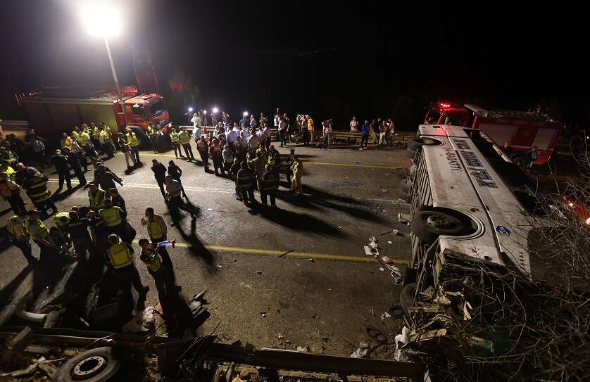 The bus crashed into a truck and a taxi carrying four passengers, all members of the same family, on Highway 89, a twisting mountain road in the upper Galilee region.