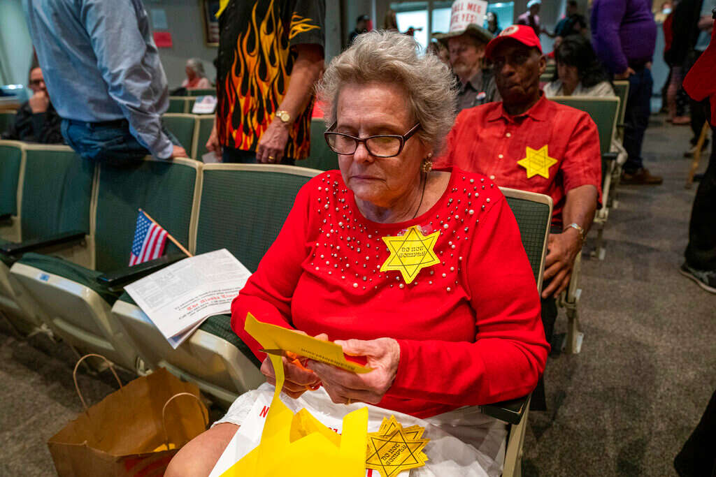 Christine Hill, who twice ran unsuccessfully for the assembly, printed out the stars at home and handed them out for others to wear to draw a comparison to the oppression and genocide of Jewish people in Nazi Germany.