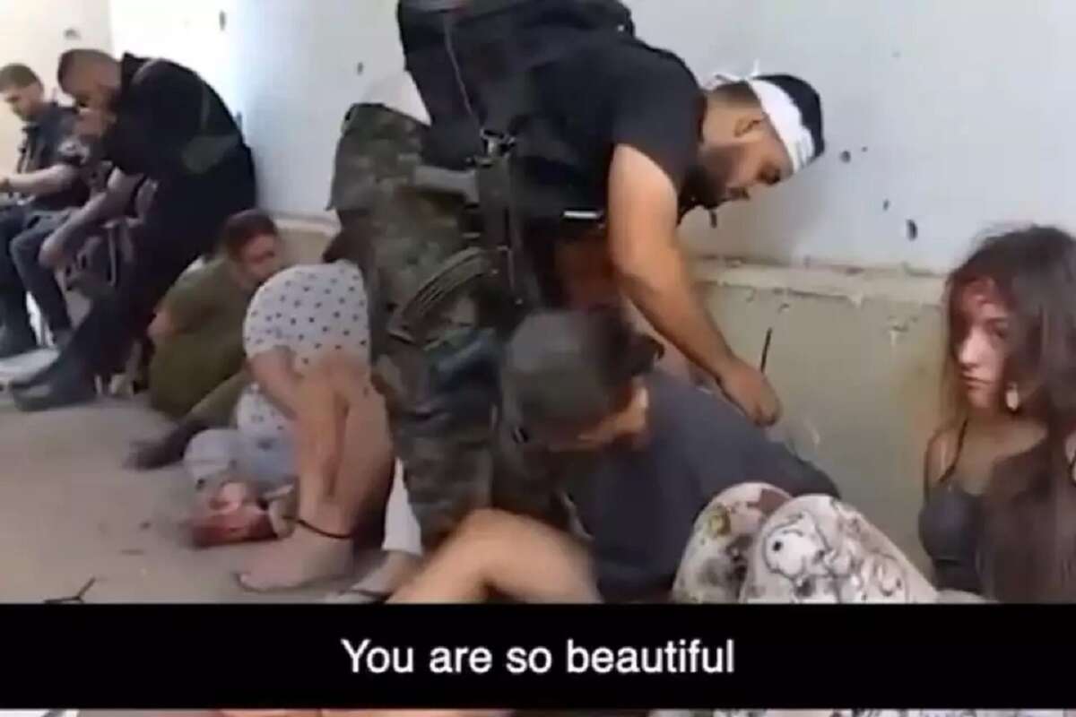 In the footage, the girls appear covered in blood, battered, and terrified as the bodies of their friends lie beside them, surrounded by hordes of terrorists. They can be seen being forcibly handcuffed and pushed against a wall by their captors. At one point, one of the terrorists is heard telling his comrades "Take their pictures." The terrified girls, their faces stained with blood, appear to be in shock. One of the hostages is heard telling the terrorists "I have friends in Palestine," likely in a desperate attempt to appeal for mercy.
