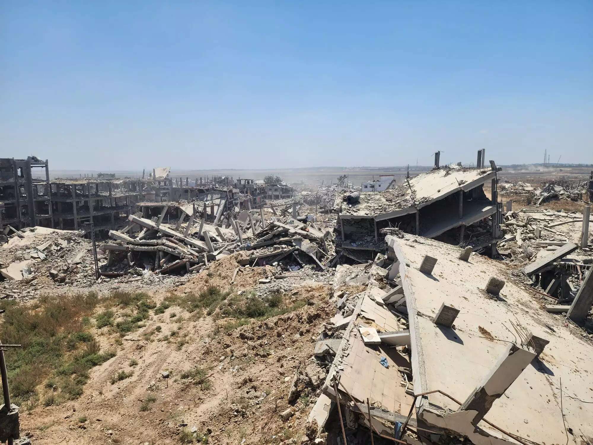 The surrounding landscape is utterly devastated. Few buildings remain standing, most reduced to skeletal remnants or piles of rubble. As in other areas where the IDF has operated, roads have been replaced by compacted dirt tracks for armored vehicle movements.