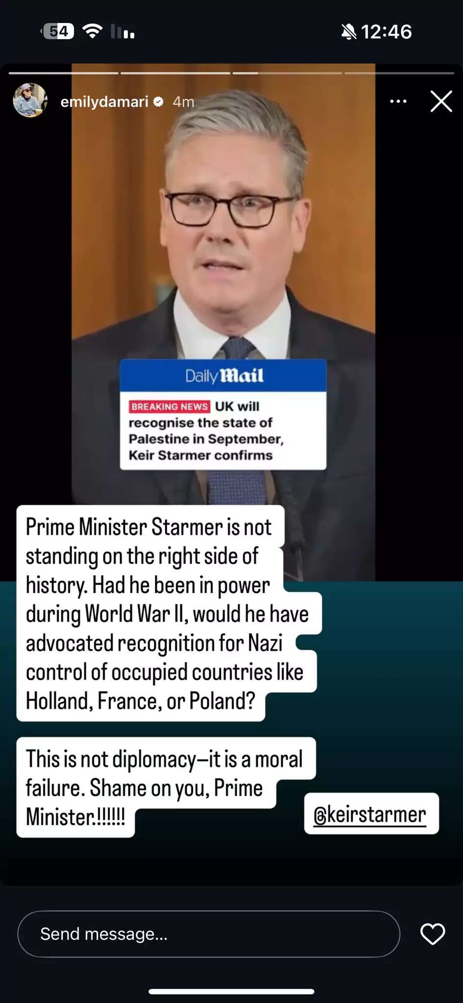 Emily Damari, a hostage survivor who was abducted from Kfar Aza kibbutz and freed after 471 days, posted a social media message targeting British Prime Minister Keir Starmer over his decision to recognize Palestinian statehood.