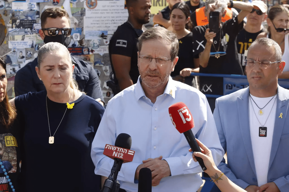 President Isaac Herzog arrived at Hostages Square, which was filling with protesters, and addressed hostage families. "You are not alone. To the world, I say – stop behaving hypocritically. Stop surrendering to Hamas and release them. Tell Hamas, 'you want supplies – first of all, release them,'" he said.