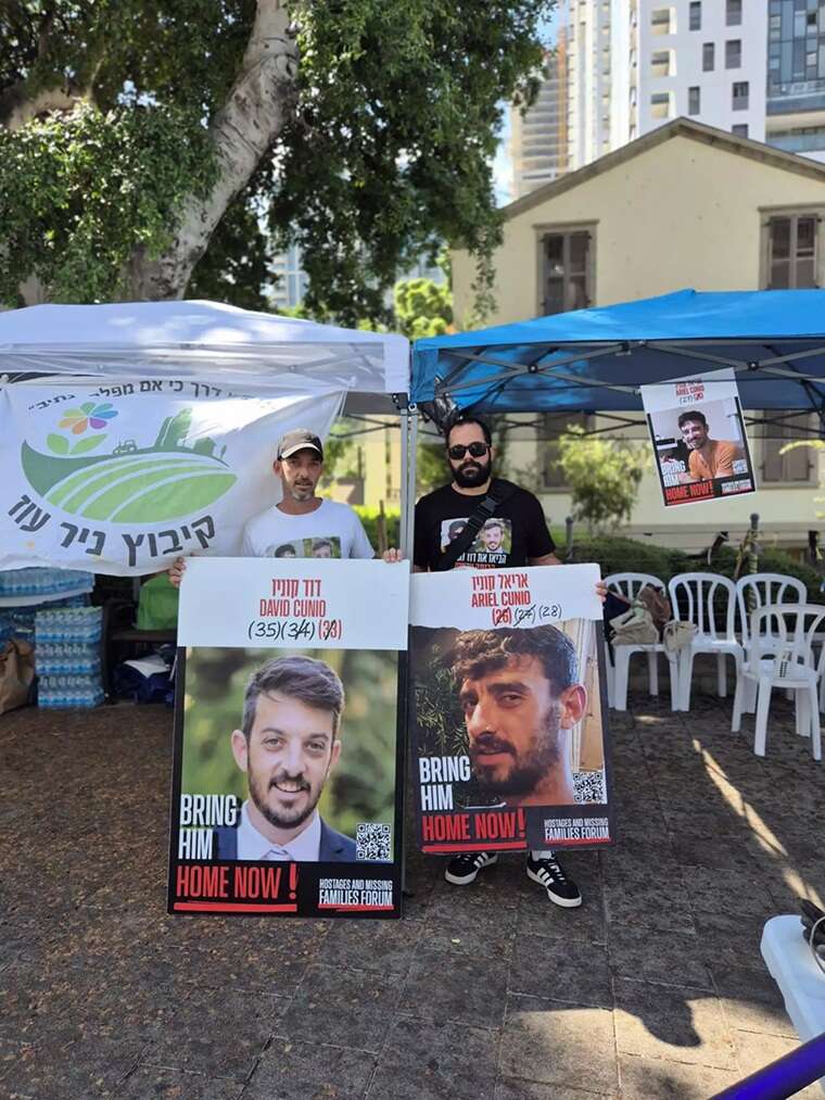 Kibbutz Nir Oz, one of the central focal points of the October 7 attack, set up a protest tent in Tel Aviv, where former hostage Yarden Bibas and the brother of David Cunio and Ariel Cunio, Eitan, arrived. Michal Lavi, the sister-in-law of Omri Miran, who is held hostage in Gaza, arrived at the Gaza border and called in the name of 50 hostages held in Gaza by Hamas and Islamic Jihad using a megaphone.