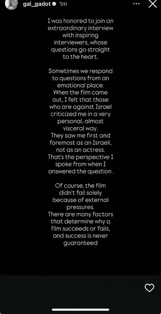 Gadot, currently in Israel enjoying an extended family vacation and having celebrated her birthday over the weekend with program host and close friend Rotem Sela, found herself compelled Sunday to address the tempest her words created, sharing with her hundreds of millions of Instagram followers a story attempting to explain her intended meaning.