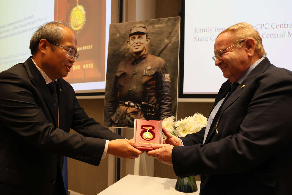 Following his powerful speech, Ambassador Xiao formally announced the honor bestowed upon the Jewish doctor by the Chinese authorities: "A decision has been made by the government of the People's Republic of China to award the commemorative medal to Dr. Jakob Rosenfeld for his remarkable contributions." He then presented the medal to Dr. Menashe Rosenfeld, the hero's nephew, to the applause of the more than 200 in attendance.