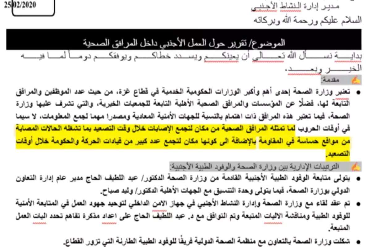Hamas also insisted that "work should not be conducted with medical delegations if senior resistance officials are (present), and regarding the simple operatives (of Hamas), caution should be taken." It was also noted that "medical members [of Hamas] from Gaza will join incoming delegations, whether they work in hospitals and their [NGOs] designated locations"