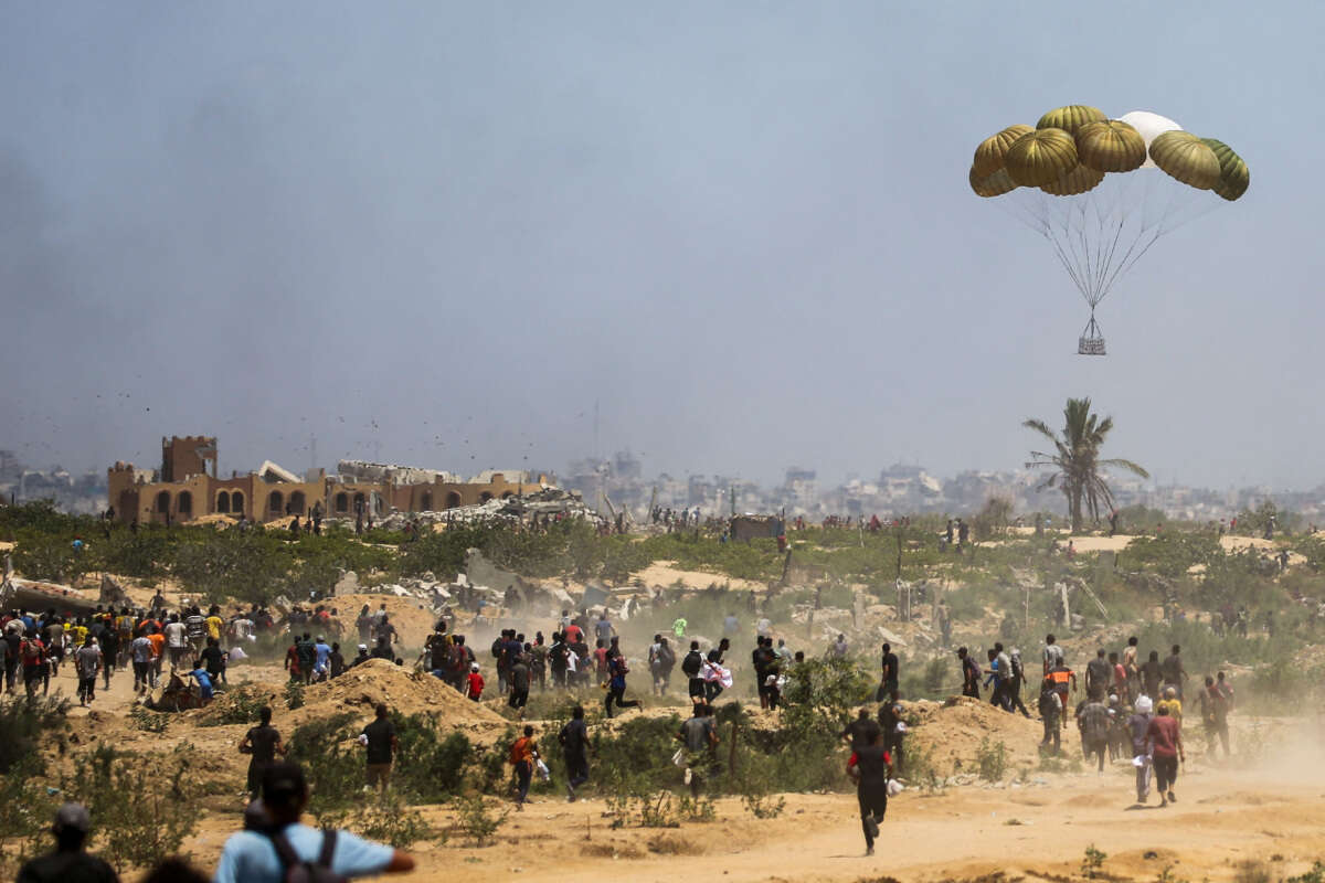 Palestinians rush to retrieve aid packages parachuted during an airdrop over Nuseirat in the central Gaza Strip on August 6, 2025 (AFP / Eyad BABA)