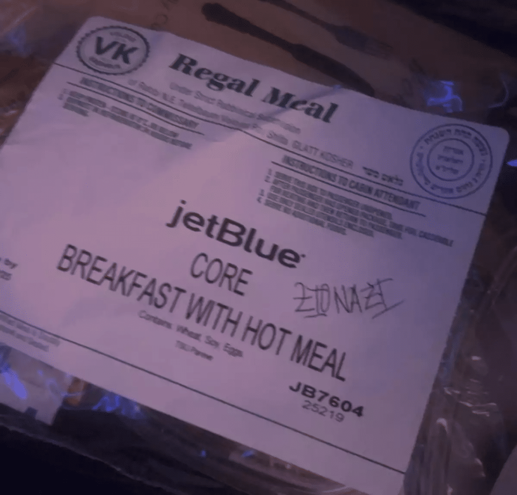 The published photo shows the meal with the inscription. The organization wrote in the post, "We are shocked to see a JetBlue passenger receive his kosher meal with the word 'Zionazi' on it. Whoever is responsible for this must be fired immediately – this feels like 1941, and Jews will not tolerate this hatred."