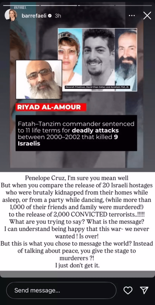 After Spanish actress Penelope Cruz posted an Instagram story showing released Palestinian prisoners reuniting with their families for the first time, Israeli model Bar Refaeli felt compelled to respond. In a sharp Instagram story of her own, she made clear exactly what she thinks about the implied comparison between the release of Palestinian prisoners and the return of Israeli hostages.