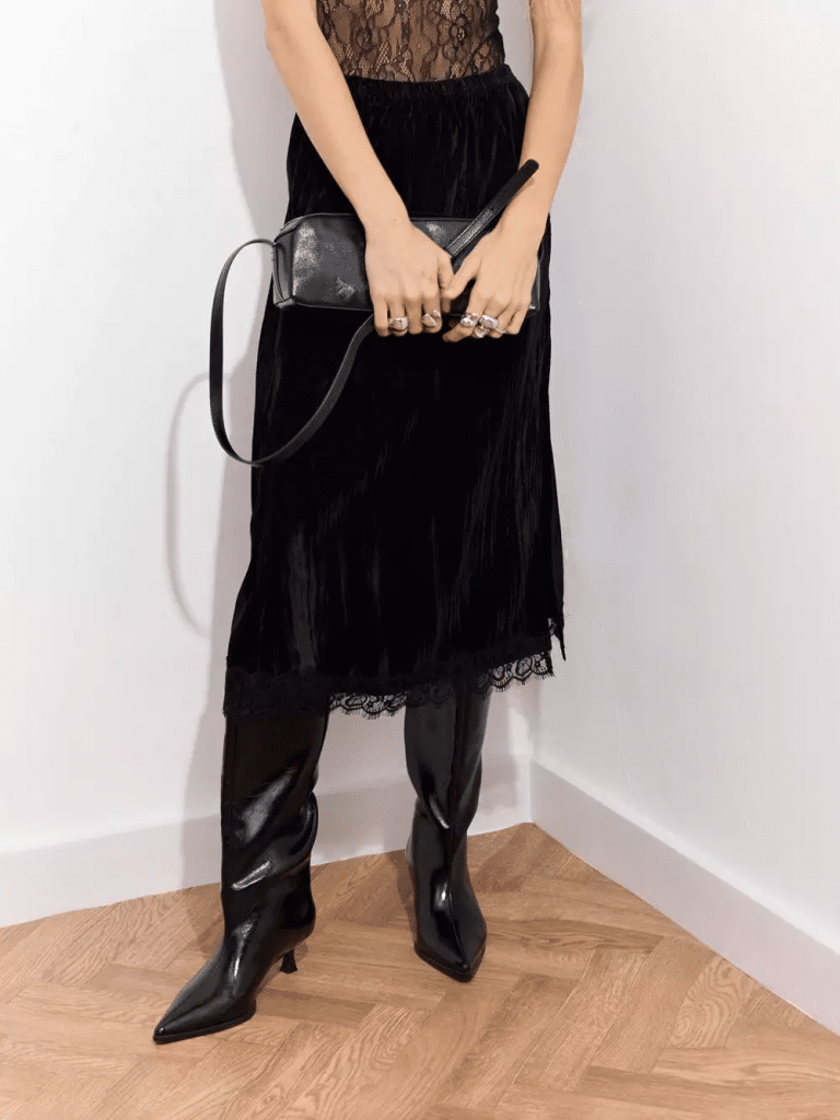 H&M: Chocolate brown furry coat, 209.30 Shekel instead of 299Story: Cream sweater, 371 Shekel instead of 530Parfois: Snake-print shoulder bag, 84.95 Shekel instead of 169.90Golbary: Plaid coat, 432.90 Shekel instead of 549.90 (Photo: Shai Yehezkel)Ronen Chen: Soft sweater in a loose fit, 299 Shekel instead of 399Mango: Long flared jeans, 209.94 Shekel instead of 349.90Steve Madden: Suede moccasin, 374.90 Shekel instead of 499.90Castro: Velvet midi skirt, 112.35 Shekel instead of 149.90Reserved: Lace shirt, 125.90 Shekel instead of 179.90Adidas Samba JP for 384.93 Shekel instead of 549.90