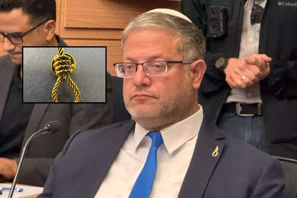National Security Minister Itamar Ben-Gvir and his Otzma Yehudit colleagues made a provocative statement Monday, arriving at a Knesset committee hearing wearing noose-shaped lapel pins as lawmakers debated legislation authorizing execution of convicted terrorists.